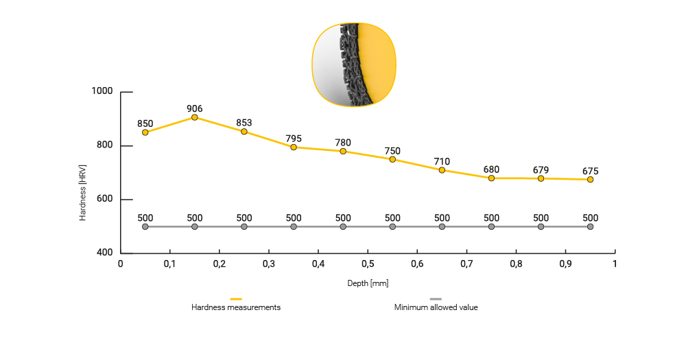 The lifespan of protection chains depends on the correct heat treatment of the elements. The hardness on the surface has a high value, which decreases with depth, however. Adequate hardness in the core provides the toughness of material, which is important for heavy loads and chain endurance.